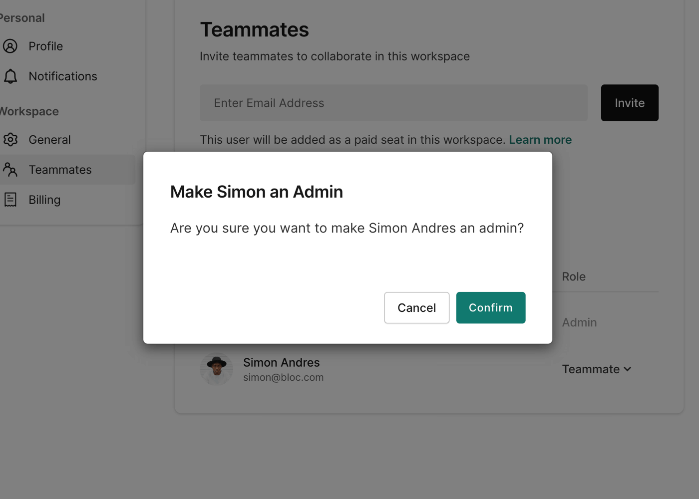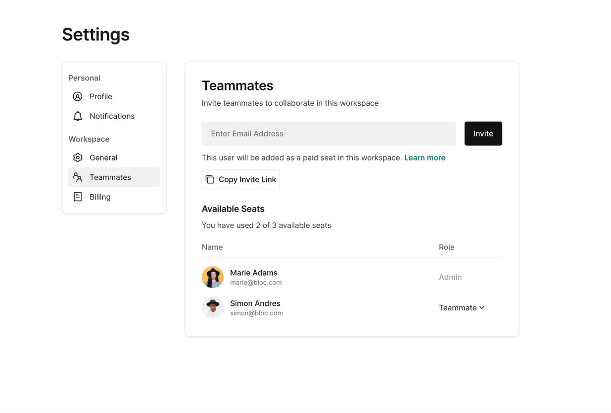 NOTE: Teammates can invite other teammates to projects, which will add the new users as paid seats to the account.