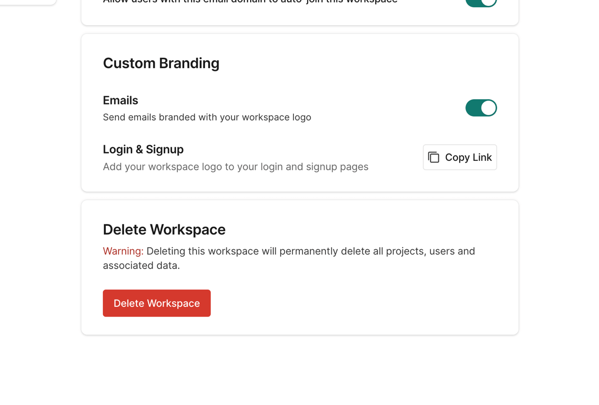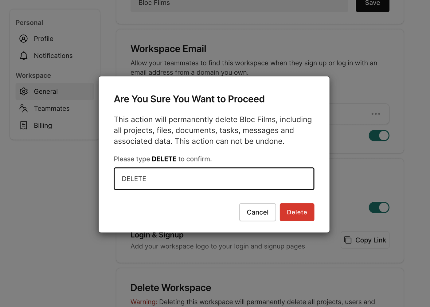 IMPORTANT: Deleting a your workspace will permanently delete all of your project and assets. There is no way to recover a workspace once it has been deleted.